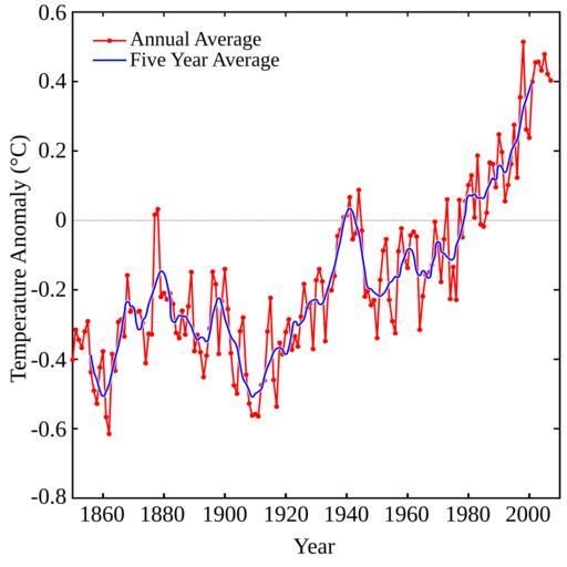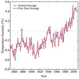 | Keywords: Instrumental Temperature Record.svg ValidSVG gnuplot This image shows the instrumental record of global average temperatures as compiled by the Climatic Research Unit of the University of East Anglia and the Hadley Centre of the UK Meteorological Office http //hadobs metoffice com/hadcrut3/diagnostics/global/nh 2Bsh/index html Data set HadCRUT3 was used http //hadobs metoffice com/hadcrut3/ HadCRUT3 is a record of surface temperatures collected from land and ocean-based stations The most recent documentation for this data set is cite journal Brohan P J J Kennedy I Haris S F B Tett and P D Jones 2006 Uncertainty estimates in regional and global observed temperature changes a new dataset from 1850 J Geophysical Research 111 D12106 10 1029/2005JD006548 Following the common practice of the IPCC the zero on this figure is the mean temperature from 1961-1990 self-made to replace Image Instrumental Temperature Record png 2008-4-3 Jak Jak Global warming graphs |