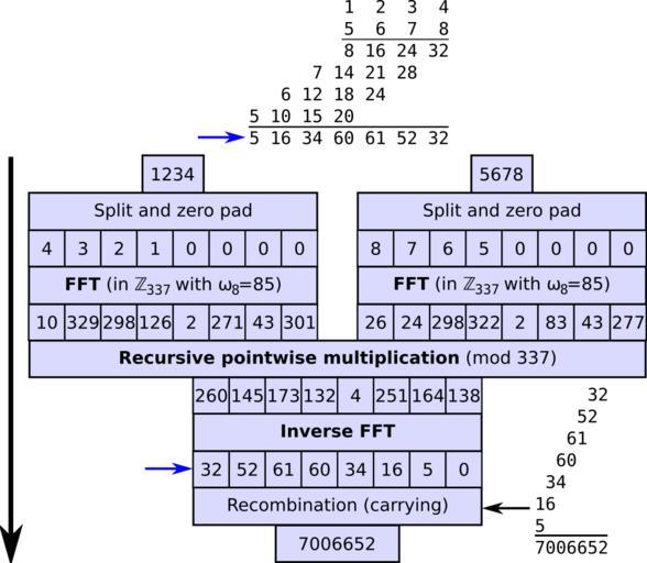 | Keywords: Integer multiplication by FFT.svg en A demonstration of an integer multiplication based on fast Fourier transforms FFTs using a number theoretic transform in the finite field of order 337 choosing 85 as an 8th root of unity since the input vectors are of length 8 Base 10 is used normally a power of 2 would used but 10 is convenient for demonstration and this technique is overkill for integers of this size long multiplication would be superior Because the inputs have 4 digits and the maximum product of two digits in base 10 is 9<sup>2</sup> the base was chosen as the first prime p greater than 4×9<sup>2</sup> 324 where 8 is invertible in the integers modulo p in this example any suitable base > 61 such as 73 would suffice but we don't know that a priori The computation at the top shows how the same acyclic convolution can be computed naively by long multiplication without carrying showing the relationship to multiplication The computation in the lower right shows recombination/carrying of the result vector by decimal shifts and adds to obtain the final integer result Note that all recursive multiplications are of smaller 3-digit integers Values are all accurate and were computed using the following Mathematica code <pre> NTTx_ b_ r_ TableModSumxn + 1 PowerModr k n b n 0 Lengthx - 1 b k 0 Lengthx - 1 INTTx_ b_ r_ Block ninverse ninverse PowerModLengthx -1 b; TableMod ninverse Sumxn + 1 PowerModr Lengthx - n k b n 0 Lengthx - 1 b k 0 Lengthx - 1 x 4 3 2 1 0 0 0 0 ; y 8 7 6 5 0 0 0 0 ; b 337; r 85; NTTx b r NTTy b r ModNTTx b r NTTy b r b INTTModNTTx b r NTTy b r b b r 1234 5678 </pre> 2011-12-17 own Dcoetzee cc-zero Uploaded with UploadWizard Multiplication |