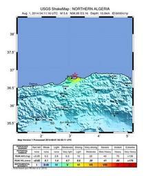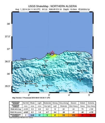 | Keywords: Intensityargel.jpg es Mapa de intensidad del sismo de Argelia de Agosto 2014 2014-08-01 11 32 16 http //earthquake usgs gov/earthquakes/eventpage/usb000rz1p summary USGS PD-USGov Uploaded with UploadWizard ShakeMaps Earthquakes of 2014 Earthquakes in Algeria |