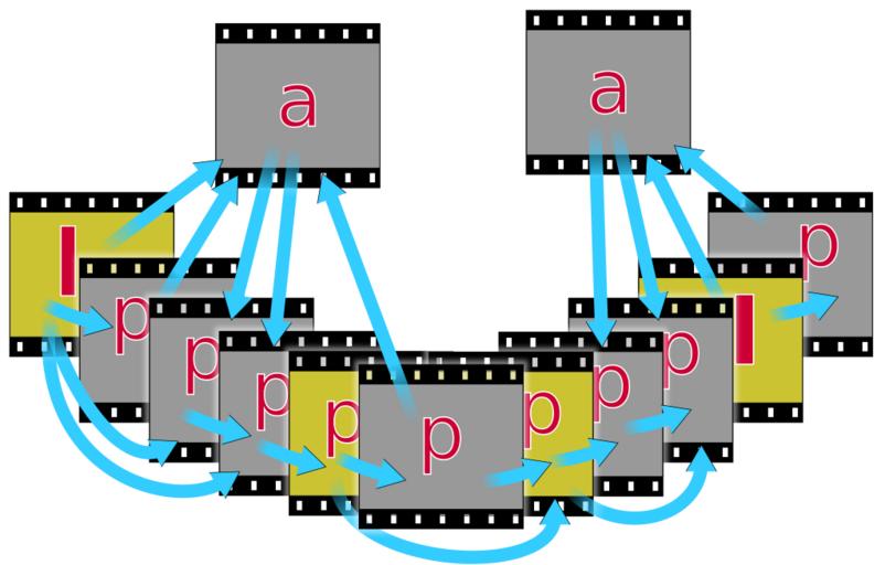 | Keywords: Inter prediction referencing VP8.svg en Schematic representation of an exemplary image sequence showing possible inter-frame referencing relationships in temporal inter prediction in VP8 Predicted frames marked with letter <span style color cc0033; >p</span> can copy motion compensated image data from other frames and code a difference signal to correct this prediction Each predicted frame can use up to three buffered reference frames Its directly preceding frame the last so-called golden frame depicted in <span style color ccc333; >yellow</span> colour and the latest alternate reference altref frame marked with letter <span style color cc0033; >a</span> Altref frames may signal to not get displayed after decoding and only replace the altref buffer content In asynchronous use cases the encoder could look ahead and use an evaluated future frame to construct an altref frame from frames that lie ahead in time Intra frames marked <span style color cc0033; >I</span> don't rely on temporal prediction and hence don't reference any other frame <span style color 33ccff; >Blue</span> arrows signify how image data gets copied over to be used to re- construct another frame 2016-07 own Flugaal other versions cc-zero TrueMotion VPx Technical diagrams Inter-frame prediction |
