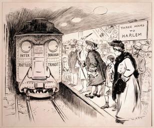 | Keywords: Interborough Rattled Transit Restored 2.png Karikatur über den als lausig empfundenen Service bei der ersten New Yorker U-Bahn <br/>Der Zug ist als missmutiges Monstrum gezeichnet der argwöhnisch auf die verärgerte Kundschaft schaut Auf ihm ist zu lesen žInterborough Rattled Transit žInterborough-Schepperbahn und žTrains run at the CO's CONVENIENCE žZüge fahren nach Belieben des Chefs Das Schild auf dem Bahnsteig kündigt an die Fahrzeit nach Harlem betrüge ždrei Stunden Political cartoon that ran in the New York Herald on March 24 1905 regarding lousy service of the Interborough Rapid Transit integrated into the New York City Subway in 1940 The subway car is labeled Interborough Rattled Transit with a sign that states Trains run at the Co 's convenience Above the waiting patrons is a sign that reads Three hours to Harlem Caricature sur le service misérable dans « l'Interborough Rattled Transit » le « chemin de ferraille métropolitain » ou les trains « run at the CO's CONVENIENCE » sont mets en service quand le monsieur le chef le fait à sa tête Interborough_Rattled_Transit_Restored png 2009-08-06 10 45 UTC Interborough_Rattled_Transit_Restored png Rogers W A William Allen 1854-1931 artist Restoration wadester16 derivative work Time3000 <span class signature-talk >talk</span> PD-old original upload log This image is a derivative work of the following images File Interborough_Rattled_Transit_Restored png licensed with PD-old 2009-08-06T05 00 29Z Wadester16 3168x2632 16768175 Bytes <nowiki>Highest-res version</nowiki> 2009-08-05T19 54 20Z Wadester16 2000x1660 6274050 Bytes <nowiki> en asdf Own work by uploader Wadester16 asdf </nowiki> Uploaded with derivativeFX Interborough Rattled Transit by W A Allen |