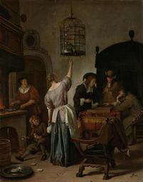 | Keywords: Interieur met een vrouw die een papegaai voert, bekend als ‘De papegaaiekooi’ Rijksmuseum SK-A-386.jpeg accession number SK-A-386 Jan Havicksz Steen credit line nl Interieur met een jonge vrouw die een papegaai voert twee triktrakspelers en andere figuren Voorstelling bekend als 'De papegaaiekooi' Links bakt een vrouw oesters op een fornuis op de grond zit een jongen die met een lepel een kat voert De vogelkooi met geopend deurtje hangt aan het plafond ; Jan Havicksz Steen ca 1625 “1679 olieverf op doek op paneel ca 1660 “1670 Height cm 50 Width cm 40 exhibition history 2011-2011 The Golden Age of Dutch Painting Doha 2007-2007 Milkmaid by Vermeer and Dutch Genre Painting Tokyo Institution Rijksmuseum canvas ; panel ; oil object history Acquisition 1809 object type Potential derivatives exist check http //commons wikimedia org/w/index php search Rijksmuseum+SK-A-386 this search PD-US PD-old Data and photography rights All data and all images made available through the API are either in the public domain or are subject to a CC0 license https //www rijksmuseum nl/en/api/terms-and-conditions-of-use cc-zero place of creation http //www rijksmuseum nl/collectie/SK-A-386 Interieur met een vrouw die een papegaai voert bekend als ˜De papegaaiekooi ™ Q17320384 Uploaded with GWToolset Interieur met een vrouw die een papegaai voert bekend als ˜De papegaaiekooi ™ Rijksmuseum SK-A-386 http //www rijksmuseum nl/media/assets/SK-A-386 Images uploaded by Fæ Images from the Rijksmuseum Paintings by Jan Steen in the Rijksmuseum Amsterdam Genre paintings by Jan Steen |