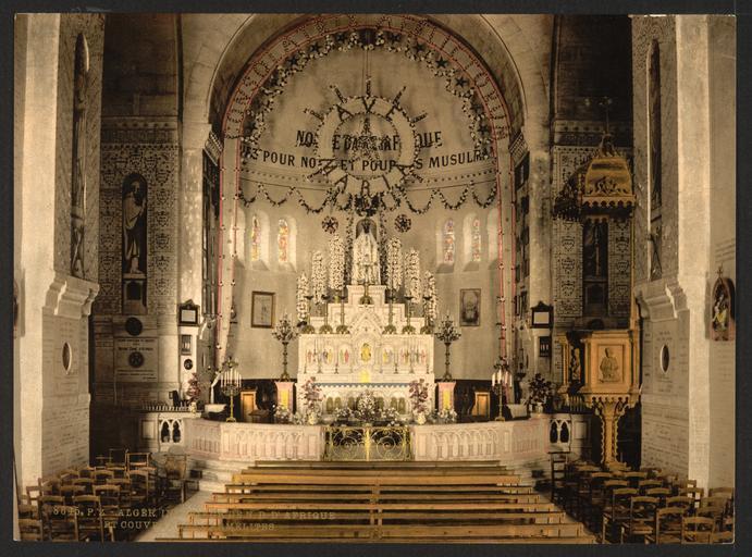| Keywords: Interior of Notre Dame d'Afrique, Algiers, Algeria WDL2456.png Artwork ru Внут еннее уб анство собо а от -Дам д'Аф ик г Алжи Алжи fr Intérieur de Notre Dame d'Afrique Alger Algérie en Interior of Notre Dame d'Afrique Algiers Algeria zh 洲 母院内部,阿尔及尔,阿尔及利亚 pt Interior da Notre Dame d'Afrique Argel Argélia ar القسم الداخلي من نوتردام أفريقيا، الجزائر، الجزائر ru Этот цветной снимок относится к се ии Люди и виды Алжи а входящей в каталог компании Дет ойт Фотог афик Кампани а нем изоб ажен собо от -Дам де Аф ик основанный в 1872 году по указу ка динала Ша ля Лавиже и основателя миссионе ского о дена Бого одицы Аф иканской или Белые отцы и сп оекти ованный ф анцузским а хитекто ом Ф омаже В издании Бедеке а 1911 года <i> С едиземномо ье </i>собо описывается как це ковь и место паломничества для больных и мо еплавателей Це емония благословения мо я сове шавшаяся священниками каждое воск есенье в 3 30 на те асе пе ед це ковью п ивлекала больше количество з ителей; с этой те асы отк ывается вид на побе ежье вплоть до Пуэнт-Пескад Дет ойт Фотог афик Кампани была основана в конце 90-х годов XIX века как издательская компания выпускающая фотоп одукцию бизнесменом из Дет ойта Уильямом А Ливингстоном младшим совместно с фотог афом и фотоиздателем Эдвином Г Хаше ом Они п иоб ели эксклюзивные п ава на использование п оцесса фотох оми ования изоб етенного в Швейца ии Фотох оми ование использовалось для п ев ащения че но-белых фотог афий в цветные и последующей печати фотог афий методом фотолитог афии Благода я этому п оцессу стало возможно массовое п оизводство цветных отк ыток снимков и альбомов для п одажи на аме иканском ынке <br>Алта и; Католические це кви fr Cet impression photochrome Vues de personnes et sites en Algérie provient du catalogue de la Detroit Photographic Company Elle représente la cathédrale de Notre Dame d'Afrique qui a été créée en 1872 par le cardinal Charles Lavigerie l'initiateur de l'Ordre des Missionnaires Notre-Dame d'Afrique ou Pères Blancs et conçue par l'architecte français Fromageau L'œuvre de Baedeker en 1911 <i>The Mediterranean La Méditerranée </i>décrit la cathédrale comme une église de pèlerinage pour les personnes malades et les marins De la terrasse en face de l'église où la bénédiction de la mer par le clergé chaque dimanche à 15h30 attire de nombreux spectateurs nous remontons la côte jusqu'à la Pointe Pescade La Detroit Photographic Company est une entreprise d'édition photographique créée à la fin des années 1890 par un homme d'affaires et éditeur de Détroit William A Livingstone Jr et le photographe et photo-éditeur Edwin H Husher Ils obtinrent les droits exclusifs d'utilisation du processus suisse Photochrome pour la conversion de photographies noir et blanc en images couleur ainsi que leur impression par photolithographie Ce processus permit la production en série de cartes postales gravures et albums en couleur vendus sur le marché américain <br>Autels; Églises catholiques en This photochrome print is from Views of People and Sites in Algeria in the catalog of the Detroit Photographic Company It depicts the Cathedral of Notre Dame d Afrique which was established in 1872 under Cardinal Charles Lavigerie the initiator of the Missionary Order of Our Lady of Africa or White Fathers and designed by the French architect Fromageau Baedeker s 1911 <i>The Mediterranean </i>described the cathedral as a pilgrimage-church for sick persons and mariners From the terrace in front of the church where the blessing of the sea by the clergy every Sunday at 3 30 attracts many spectators we survey the coast as far as the Pointe Pescade The Detroit Photographic Company was launched as a photographic publishing firm in the late 1890s by Detroit businessman and publisher William A Livingstone Jr and photographer and photo-publisher Edwin H Husher They obtained the exclusive rights to use the Swiss Photochrom process for converting black-and-white photographs into color images and printing them by photolithography This process permitted the mass production of color postcards prints and albums for sale to the American market <br>Altars; Catholic churches zh 这张彩色照片出自底特律摄影公司目录中 阿尔及利亚人物和景点风景 部分 照片拍摄的是 洲 母 殿,于 1872 年 红衣主教查尔斯·拉维日里( 洲 母传教会 苏丹后宫 的创始人或称为 白人教父 )的领导下建立,其设计师为法国建筑师弗马诺 德克尔 1911 年的 <i> 中海 </i>将该大教堂描述为: 病人和水手的 教堂 教堂前 的平台上,每个周日下午 3 时 30 分由牧师举行的海洋祈福吸引了众多观众,我们 虑到 至 Pointe Pescade 的海岸 底特律摄影公司是 19 世纪 90 年代 成立的 家摄影出版公司,创办人是底特律商人兼出