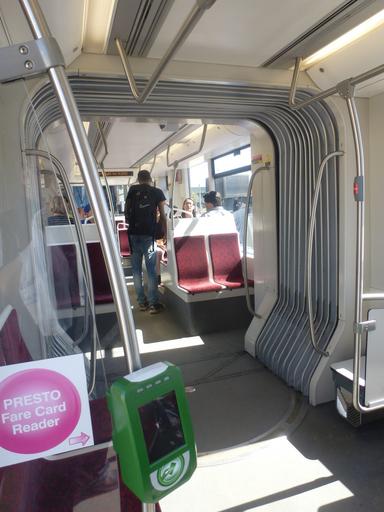 Keywords: Interior of one of the TTC's new prototype Flexity Outlook streetcars, at the Russell Carhouse, 2014 05 24 (11).jpg Interior of one of the TTC's new prototype Flexity Outlook streetcars at the Russell Carhouse 2014 05 24 11 <br/> I visited the Russell Carhouse during Doors Open Toronto 2014 and took photos of two legacy streetcars the TTC's last Peter Witt streetcar and PCC streetcar 4959 and one of the TTC's two prototype Toronto Flexity Outlook streetcars http //www flickr com/photos/55289779 N00/14076201898/ Interior of one of the TTC's new prototype Flexity Outlook streetcars at the Russell Carhouse 2014 05 24 11 2014-05-24 15 19 http //www flickr com/people/55289779 N00 booledozer 43 664097 -79 322178 source Flickr PermissionOTRS 2012092210003274 Revent Taken with Panasonic Lumix DMC-ZS10 Photographs by Geo Swan Bombardier LRV in Toronto during Door Open 2014 Presto cards on the TTC Fare collection on the TTC's Bombardier light rail vehicles ImageNote 1 894 3060 782 1142 3240 4320 2 The new Flexity vehicles have seven segments four of which have doors The central two doors have a vending robot that accepts cash Riders are expected to use the machine to purchase their fares on the honor system All the doors have a Presto card reader where riders tap their card on entry GO Transit riders use the same Presto card and on most vehicles are supposed to tap their card on exit as well ImageNoteEnd 1 |