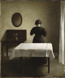 | Keywords: Interior (Vilhelm Hammershøi) - Nationalmuseum - 21409.tif Artwork Creator Vilhelm Hammershøi Interior A solitary woman in a sparsely furnished room is a recurring theme in Hammershøi ™s pictures The light comes from the side and the figure often has her back to the viewer Clear models for these interiors can be found in 17th-century Holland or early 19th- century Denmark But Hammershøi ™s silent empty rooms also have an intense suggestive mood all their own Most of his interior scenes were painted in his home in Copenhagen but this one was executed in London The model is the artist ™s wife Ida En ensam kvinna i ett sparsamt möblerat rum är ett Ã¥terkommande tema i Hammershøis bilder Ljuset faller in frÃ¥n sidan och ofta vänder modellen ryggen mot betraktaren Hans interiörer har tydliga förebilder i det holländska 1600-talet eller i det tidiga danska 1800-talet Men Ham mershøis tysta och tomma rum har ocksÃ¥ en alldeles egen förtätad och suggestiv stämning De flesta av hans interiörbilder tillkom i hemmet i Köpenhamn Denna mÃ¥lning är dock utförd i London Modellen är konstnärens hustru Ida header A solitary woman in a sparsely furnished room is a recurring theme in Hammershøi ™s pictures The light comes from the side and the figure often has her back to the viewer Clear models for these interiors can be found in 17th-century Holland or early 19th- century Denmark But Hammershøi ™s silent empty rooms also have an intense suggestive mood all their own Most of his interior scenes were painted in his home in Copenhagen but this one was executed in London The model is the artist ™s wife Ida En ensam kvinna i ett sparsamt möblerat rum är ett Ã¥terkommande tema i Hammershøis bilder Ljuset faller in frÃ¥n sidan och ofta vänder modellen ryggen mot betraktaren Hans interiörer har tydliga förebilder i det holländska 1600-talet eller i det tidiga danska 1800-talet Men Ham mershøis tysta och tomma rum har ocksÃ¥ en alldeles egen förtätad och suggestiv stämning De flesta av hans interiörbilder tillkom i hemmet i Köpenhamn Denna mÃ¥lning är dock utförd i London Modellen är konstnärens hustru Ida 1898 Oil on canvas Olja pÃ¥ duk Size cm 46 51 5 Framed Size cm 66 77 6 Institution Nationalmuseum Stockholm Signerad Hammershøi 1898 accession number 21409 NM 4357 place of creation Nationalmuseum Nationalmuseum Stockholm cooperation project Licensed-PD-Art PD-old-auto PD-Nationalmuseum_Stockholm 1916 Media contributed by Nationalmuseum Stockholm 2016-10 Paintings by Vilhelm Hammershøi in the Nationalmuseum Stockholm 1898 paintings |