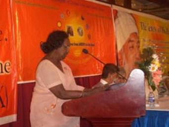 Keywords: International Symposium (2).jpg An official from KAFI welcoming the audience own or Kalki Avatar Foundation International Mfi media Gohar Shahi Symposia