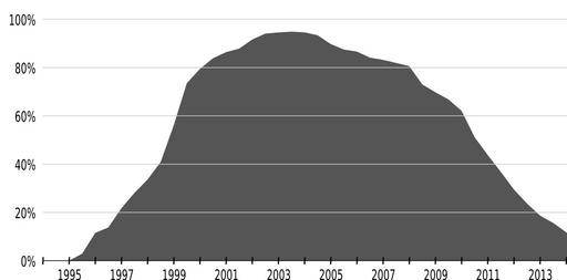 | Keywords: Internet-explorer-usage-data.svg update ShouldBeText It could be reproduced using <graph> tag This file is in SVG format That means you can edit it with a text editor or an SVG-compatible graphics editor However you will find it better to use a text editor because otherwise your edits will be too imprecise Adding new data Updated image is available from http //postimg org/image/4p275r9g1/ Whoever has uploads rights to wikimedia - please replace the current version with it The 2011 5+ data is taken from http //en wikipedia org/wiki/Usage_share_of_web_browsers Wikimedia section If the data is between 1996 and 2010 just find that point in the file and update it For example at the moment the code for the usage statistics between 2000 and 2001 looks like this L 2000 83 75 L 2001 90 To insert data for the midpoint of 2000 just make it look like this L 2000 83 75 L 2000 5 86 L 2001 90 If you are adding data for before 1996 or after 2010 you'll need to change the transformations on the groups This requires moderately detailed understanding of SVG Seek help if you need it Source The original graph is at en Image Internet Explorer usage share png That is the original source of the data The data at the time of this SVG's creation was Date Percentage 1996 3 75 1997 17 5 1998 35 1999 62 5 2000 83 75 2001 90 2002 95 25 2003 94 75 2004 92 625 2005 86 903861 2006 1 El T 13 11 25 June 2006 UTC en wikipedia 2006-06-25 El T wikipedia en Later versions were uploaded by Henrikb4 Schapel at http //en wikipedia org en wikipedia El T original upload log page en wikipedia Internet-explorer-usage-data svg 2007-02-02 14 08 Schapel 570×290×0 4065 bytes New graph created from data in the usage share article 2006-08-17 14 58 Henrikb4 566×290×0 3084 bytes ' 2006-06-25 13 11 El T 566×290×0 3108 bytes An SVG version of the graph The easiest way to update the graph is to use a TEXT editor NOT a graphics one Just find the list of numbers and add in the statistic you want to use Just make sure you put them in order If you are adding data for before Internet Explorer diagrams |