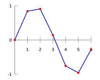 | Keywords: Interpolation example linear.svg Illustration of linear interpolation on a data set The same data set is used for other interpolation methods in the interpolation article self-made in Gnuplot 2007-06-26 Berland Based on original PNG version by User Jitse Niesen with gnuplot source code and svg-version by User Cronholm144 Gnuplot source code set terminal svg fname Vera fsize 25 set output Interpolation_example_linear svg set key off set xzeroaxis set xtics axis 1 1 set ytics nomirror 1 set border 2 set samples 2 plot - with lines linetype 3 linewidth 4 \ - with points linetype 1 pointtype 7 pointsize 0 7 \ 0 with lines linetype -1 linewidth 1 0 0 1 0 8415 2 0 9093 3 0 1411 4 -0 7568 5 -0 9589 6 -0 2794 e 0 0 1 0 8415 2 0 9093 3 0 1411 4 -0 7568 5 -0 9589 6 -0 2794 e Interpolation |