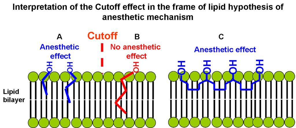 | Keywords: Interpretation of the cutoff effect in the frame of lipid hypothesis of anesthetic mechanism.png en A Short hydrocarbon chains are relatively rigid in terms of conformational enthropy and are close to alkanol hydroxyl group buoy tethered to the interface This makes short chain alkanols efficient mediators that redistribute lateral stress from membrane interior to its interface B This ability decreases in the row of n-alkanols since longer chains are more flexible and are not so tightly tethered to the hydroxyl group C Polyhydroxyalkanes 1 6 11 16-hexadecanetetraol and 2 7 12 17-octadecanetetraol exhibit significant anesthetic potency as was predicted by cutoff effect because the length of the hydrocarbon chain between hydroxyl groups is smaller than the cutoff Own Akuznetsova 2009-04-19 public domain This picture was made based on information obtained from J Med Chem 2005 48 12 pp 4172 “4176 Unidentified biology diagrams |
