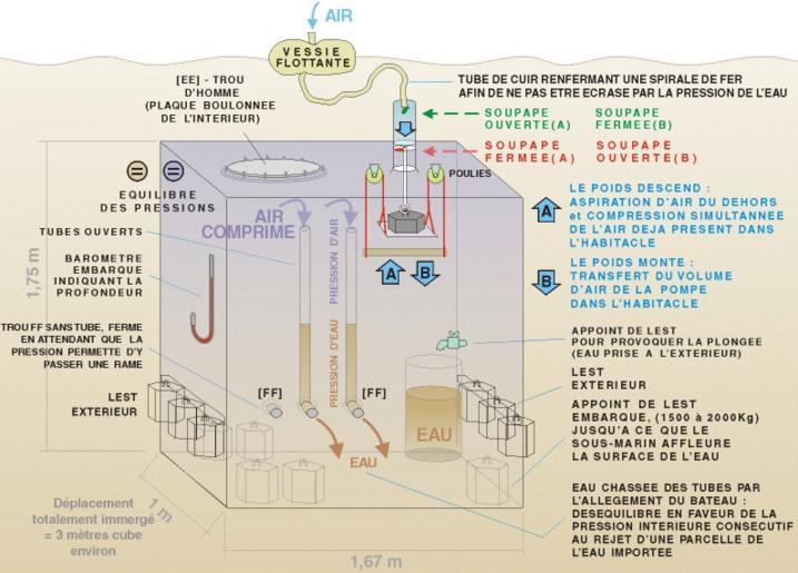Keywords: Invention ssmarin.gif fr Ce premier modèle de sous-marin est décrit par Papin dans un ouvrage intitulé Recueil de Diverses Pièces C'est un paralépipède en fer dans lequel on charge des poids pour l'alourdir afin son poids équivale au poids de son volume en eau et qu'on l'on met sous pression d'air afin qu'il résiste à la pression de l'eau à l'extérieur du vaisseau Un appoint de lest réalisé grâce à une sorte de robinet doit permettre au vaisseau de plonger Ce vaisseau a été construit mais jamais essayé il fut détruit en tombant d'une grue dont la flèceh s'est rompue Papin analysera tout de même les défauts de cette première conception et imaginera Urinator son deuxième modèle de sous-marin décrit en 1695 Own Vincentrey41 Submarines Diagrams in French |