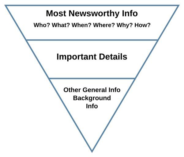| Keywords: Inverted pyramid.svg The Inverted pyramid technique of journalism writing Inverted_pyramid jpg 2011-01-24 09 00 UTC Inverted_pyramid jpg The Air Force Departmental Publishing Office AFDPO derivative work Makeemlighter Vector text versions Inverted pyramid 2 svg ; Translations Arabic Korean Redrawn as SVG Makeemlighter Inverted_pyramid jpg Original upload log This image is a derivative work of the following images File Inverted_pyramid jpg licensed with PD-USGov-Military-Air Force 2011-01-23T21 26 05Z P S Burton 718x569 31907 Bytes <nowiki> http //www shaw af mil/library/editorialpolicy submissions/newsarticles asp US Air Force Shawn Air Force Base 20th FW Editorial Policy Submission Guidelines Not given T</nowiki> Uploaded with derivativeFX Journalism |