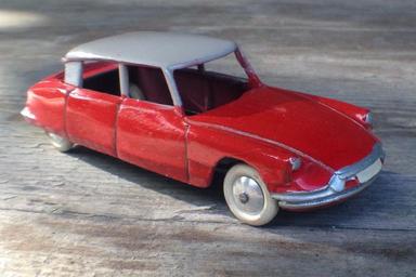 | Keywords: This is not the wellknown Dinky Toys 24c Citroen DS. It's made by an unknown brand from Spain, named Invicta, in 1957. It is different from the Dinky, however it must be inspired on it. There is such a strong resemblance, but at least 41 spots can be found where it differs from the Dinky DS. It is from a genuine mould made by Invicta and definitely no copy. This is considered to be the rarest of all Citroen DS toys. To the day there are only 2 pieces known worldwide. Both in different colours. This one comes in a beautiful cherry red with beige roof. It's all original paint. This is the actual model of which (bad) pictures were used in magazines like 'L'Argus de la Miniature and Passion 43'.