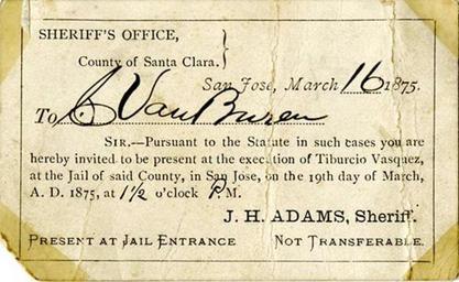 | Keywords: invitation attend execution tiburcio vasquez 1875 march 16 march16 santa clara santaclara county (calif.) calif sheriff's dept. sheriffsdept text document writing Repository: California Historical Society Digital object ID: Vault 306.001.jpg Date: 1875 March 16 Call number: Vault 306 Preferred citation: [Invitation to attend the execution of Tiburcio Vasquez], Vault 306, courtesy, California Historical Society, Vault 306.001. Repository: California Historical Society Digital object ID: Vault 306.001.jpg Date: 1875 March 16 Call number: Vault 306 Preferred citation: [Invitation to attend the execution of Tiburcio Vasquez], Vault 306, courtesy, California Historical Society, Vault 306.001. |