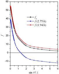 | Keywords: Iodine scattering factor.png en X-ray scattering factor of iodine Z 53 as a function of sinθ/λ In black f0 is the scattering factor without anomalous scattering correction far from the absorption edges of iodine The blue and red curves are the real part of the scattering factor taking into account the anomalous scattering for 2 75Å and 1 94Å respectively Three L-absorption edges of iodine lie between these two wavelengths Data from International Tables for Crystallography vol C 1999 own Perditax 2010-09-20 Iodine |