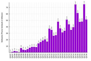 | Keywords: Iphone sales worldwide.svg de Weltweite Verkaufszahlen des iPhones 2016-07-31 own StefanPohl other versions cc-zero Data from http //www statista com/statistics/263401/global-apple-iphone-sales-since-3rd-quarter-2007/ Statista Q3 '07 0 27 Q4 '07 1 12 Q1 '08 2 32 Q2 '08 1 7 Q3 '08 0 72 Q4 '08 6 89 Q1 '09 4 36 Q2 '09 3 79 Q3 '09 5 21 Q4 '09 7 37 Q1 '10 8 74 Q2 '10 8 75 Q3 '10 8 4 Q4 '10 14 1 Q1 '11 16 24 Q2 '11 18 65 Q3 '11 20 34 Q4 '11 17 07 Q1 '12 37 04 Q2 '12 35 06 Q3 '12 26 03 Q4 '12 26 91 Q1 '13 47 79 Q2 '13 37 43 Q3 '13 31 24 Q4 '13 33 8 Q1 '14 51 03 Q2 '14 43 72 Q3 '14 35 2 Q4 '14 39 27 Q1 '15 74 47 Q2 '15 61 17 Q3 '15 47 53 Q4 '15 48 05 Q1 '16 74 78 Q2 '16 51 19 IPhone charts |