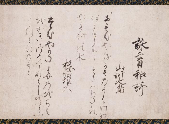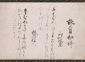 | Keywords: Ipponkyo kaishi - hanging scroll.jpg Part of the Poems on the Chapters of the Lotus Sutra 品経懐紙 Ipponkyō kaishi collection of exemplary poets and calligraphy of the late Heian period The collection consists of 28 poems on the Lotus Sutra by as many poets ~ 1180 1183 ink paper Size cm 47 6 27 4 Institution Kyoto National Museum object history This poem by Saigyō was removed from the collection and mounted as hanging scroll The Ipponkyō kaishi album including this hanging scroll has been designated as National Treasure in the category writings accession number B甲1000 http //www emuseum jp/detail/101096/001/031 word d_lang en s_lang en class 2 title c_e region era cptype owner pos 1 num 2 mode detail century Emuseum PD-old-100 Ipponkyō kaishi Saigyō Kakemono |