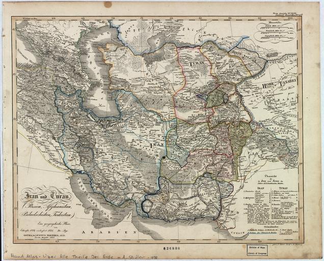 | Keywords: Iran and Turan- Persia, Afghanistan, Baluchistan, Turkestan WDL12990.png Artwork ru Бе гхаус Ген их Ка л Вильгельм 1797 1884 гг fr Berghaus Heinrich Karl Wilhelm 1797-1884 en Berghaus Heinrich Karl Wilhelm 1797-1884 zh 海因里希·卡尔·威廉· 豪斯,1797-1884 年 pt Berghaus Heinrich Karl Wilhelm 1797 a 1884 ar بيرغهاوس، هاينرش كارل فيلهيلم، 1797-1884 es Berghaus Heinrich Karl Wilhelm 1797-1884 ru И ан и Ту ан Пе сия Афганистан Белуджистан Ту кестан fr Iran et Touran Perse Afghanistan Baloutchistan et Turkestan en Iran and Turan Persia Afghanistan Baluchistan Turkestan zh 伊 和图兰:波斯 阿富汗 俾路支和 其斯 pt Irã e Turan Pérsia Afeganistão Baluquistão e Turquestão ar إيران وتوران بلاد فارس، أفغانستان، بلوشستان، تُرْكِستان ru Эта ка та С едней Азии входила в издание <em> Stieler's Hand-Atlas über alle Theile der Erde </em> Пе еносной атлас всех частей Земли Штиле а под едакцией Адольфа Штиле а опубликованное в 1839 году фи мой Юстуса Пе теса в Готе Ге мания Ка та была аз аботана и составлена в 1829 году Ген ихом Ка лом Вильгельмом Бе гхаусом 1797 1884 гг и дополнена им же в 1834 году В п онуме ованных условных обозначениях в п авом нижнем углу ка ты пе ечислены ст аны егиона по состоянию на 1834 год В их число входили Пе сидская импе ия Афганистан состоявший из шести отдельных те ито иальных единиц феде ация княжеств Белуджистана под уп авлением си да а вождя племени Келата и яд ханств и эми атов С едней Азии в том числе Хива и Буха а обе асполагались на те ито ии сов еменного Узбекистана Бе гхаус под азделяет обши ный егион показанный на ка те на два суб егиона И ан и Ту ан Ту аном на пе сидском языке назывался егион С едней Азии к севе у от Афганистана асштаб ка ты указан в немецких ф анцузских и геог афических милях Бе гхаус был немецким геог афом ка тог афом и ученым Получив топог афическую подготовку он некото ое в емя аботал инжене ом-геодезистом в Гене альном штабе п усской а мии В 1836 году он основал геог афическую школу в Потсдаме Бе гхаус был д угом и со атником великого естествоиспытателя и исследователя Александ а фон Гумбольдта 1769 1859 гг Он одним из пе вых стал включать в ка ты и атласы данные из метео ологии и климатологии гид ог афии геологии этног афии и д угих научных дисциплин <br>А авийский залив; Балканский полуост ов; Пе сидский залив fr Cette carte d'Asie centrale parut dans l'édition de 1839 de <em>Stieler's Hand-Atlas über alle Theile der Erde</em> Atlas manuel de toutes les régions du monde de Stieler édité par Adolf Stieler et publié par la société de Justus Perthes à Gotha en Allemagne La carte fut compilée et dessinée en 1829 par Heinrich Karl Wilhelm Berghaus 1797 1884 puis ce dernier la mit à jour en 1834 La légende numérotée dans l'angle inférieur droit de la carte indique les États de la région tels qu'ils existaient en 1834 Ils incluaient l'Empire perse l'Afghanistan composé d'entités distinctes une fédération d'États au Baloutchistan gouvernée par le sirdar chef tribal de Kalat et des khanats et des émirats en Asie centrale notamment Khiva et Boukhara tous deux en actuel Ouzbékistan Berghaus divise la vaste région représentée sur la carte en deux sous-régions l'Iran et le Touran cette dernière étant une dénomination géographique d'origine persane désignant la région d'Asie centrale au nord de l'Afghanistan L'échelle est fournie en milles allemands français et géographiques Géographe cartographe et érudit allemand Berghaus reçut une formation d'arpenteur et travailla un temps en tant qu'ingénieur géographe pour l'état-major général de l'armée prussienne En 1836 il fonda une école de géographie à Potsdam Ami et collaborateur de l'éminent naturaliste et explorateur Alexander von Humboldt 1769 1859 Berghaus fut l'un des premiers à incorporer aux cartes et aux atlas des données issues de domaines scientifiques tels que la météorologie et la climatologie l'hydrographie la géologie l'ethnographie et bien d'autres encore <br>Golfe Arabique; Péninsule balkanique; Golfe Persique en This map of Central Asia appeared in the 1839 edition of <em>Stieler's Hand-Atlas über alle Theile der Erde</em> Stieler s portable atlas of all parts of the Earth edited by Adolf Stieler and published by the firm of Justus Perthes in Gotha Germany The map was compiled and drawn in 1829 by Heinrich Karl Wilhelm Berghaus 1797 1884 and updated by him in 1834 The numbered key in the lower right-hand corner of the map indicates the states of the region as they existed in 1834 They included the Persian Empire Afghanistan composed of six separate entities a federation of states in Baluchistan und