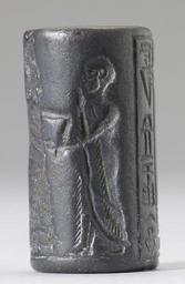 | Keywords: Iranian - Cylinder Seal - Walters 42775 - Side B.jpg Walters Art Museum artwork Seated King Man + Inscription <br> Incorrect-Two uses of 42775 Although the Achaemenids used stamp seals for private documents cylinder seals continued to be used for official royal business This seal depicts the king fighting a lion-griffin in two scenes First he engages in close combat with the lion-griffin Second the king standing on a reclining sphinx aims his bow at the mythical beast also standing on a sphinx Between them is the benign god Ahura Mazda in an oval cartouche with a winged disk above between 550 330 BC Achaemenid chalcedony cm 2 8 1 4 accession number 42 775 38841 Sadie Jones Mrs Henry Walters New York date and mode of acquisition unknown Sale Joseph Brummer New York 1941 Walters Art Museum 1941 by purchase Museum purchase 1941 Ancient Persia The Art of an Empire The Walters Art Gallery Baltimore; University Art Museum University of Texas at Austin Austin 1978 place of origin Iran Walters Art Museum license Cylinder seals in the Walters Art Museum Art of Iran Iranian Seated-King Figure and Inscription Walters 42775-No 1 Cuneiform on cylinder seals Walters Art Museum cylinder seals with cuneiform Media contributed by the Walters Art Museum needs category review |