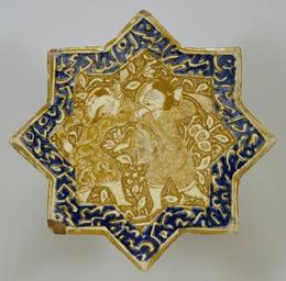 | Keywords: Iranian - Star Tile with Combat Scene - Walters 481288.jpg The Persian verses written around the outer blue band come from the Shahnama Book of Kings the national epic of Iran and specifically from a section of the text that recounts the tragic combat between the great hero Rustam and his son Sohrab It is unlikely however that the two men fighting in the center of this tile are meant to illustrate the Shahnama text 2nd half Other date century 13 Ilkhanid fritware with underglaze-painted and overglaze luster decoration cm 20 5 20 7 1 8 accession number 48 1288 2405 Dikran Kelekian Paris and New York Henry Walters city Baltimore Walters Art Museum Henry Walters Acquired by Henry Walters 1926 Calligraphy in the Arts of the Muslim World Asia House Gallery New York; Cincinnati Art Museum Cincinnati; Seattle Art Museum Seattle; Saint Louis Art Museum St Louis 1979 Highlights from the Collection The Walters Art Gallery Baltimore 1998-2001 The Legacy of Genghis Khan Courtly Art and Culture in Western Asia 1256-1353 The Metropolitan Museum of Art New York; Los Angeles County Museum of Art Los Angeles 2002-2003 place of origin Iran Walters Art Museum license Islamic art in the Walters Art Museum Art of Iran Sohrab Octagrams |