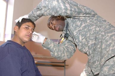 | Keywords: Iraqi Army Takes Care of Locals' Health Issues DVIDS34072.jpg en Cpl Tony Goins medic Headquarters and Headquarters Company 2nd battalion 12th Cavalry regiment 1st Cavalry Division treats a local Iraqi boy at a school in Bakariya village Dec 9 <br>Unit 7th Mobile Public Affairs Detachment 2006-12-09 Spc Shea Butler https //www dvidshub net/image/34072/iraqi-army-takes-care-locals-health-issues 34072 2006-12-13 14 13 BAKARIYA VILLAGE PD-USGov 12th Cavalry Regiment United States 1st Cavalry Division United States Images from DoD uploaded by Fæ |