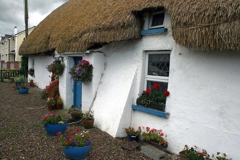 Keywords: ireland door ballyedmond house home thatch thatched roof white blue stone stucco building natural stone decor plants flowers decorated