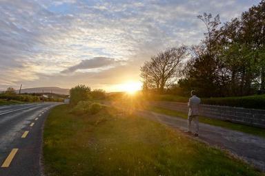 Keywords: ireland sunset road sky afterglow back light abendstimmung asphalt scenic landscape auto drive sun light