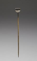 | Keywords: Irish Celtic - Hand-Pin - Walters 542370.jpg Called a hand-pin because it resembles the palm of the hand with the fingers pointing out at right angles this pin served as a cloak fastener Hand-pins were fashionable in Ireland and Scotland in the 6th and 7th centuries Originally the five pellet fingertips along the top of the pin and the sunken background of the spiraling design on its crescent-shaped palm were filled with colorful enamel A tie once passed through the hole in the center of the palm and was wrapped around the tip of the pin to keep it securely in place The shape of the pin is a creative adaptation of a Romano-British brooch design dating from the 4th century century 6 7 Early Medieval bronze cm 22 2 2 1 9 accession number 54 2370 30021 Robert Day Cork Robert Day Sale Sotheby Wilkinson Hodge London May 19-22 1913 no 357 Patrick O' Connor New York Walters Art Museum 1950 by purchase Museum purchase with funds provided by the S A P Fund 1950 Jewelry - Ancient to Modern The Walters Art Gallery Baltimore 1979-1980 place of origin Burgundy France Walters Art Museum license Medieval metalwork in the Walters Art Museum Celtic jewellery Jewellery in the Walters Art Museum Celtic art |