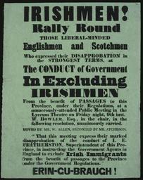 | Keywords: text writing outdoor Text in protest at government's exclusion of Irishmen from the benefits of passages to Wellington Province. Report of meeting at Lyceum Theatre on Friday 9th inst. W. Bowler in chair, and the resolution moved by Mr W. Allen and seconded by Mr Atcheson "That this meeting express their marked disapprobation of the conduct of I. E. Featherston, Superintendant of this province, in instructing the Government agents in England to exclude Irish Immigrants from the benefit of passages to the Province under the Government Regulations". New Zealand spectator and Cook's Strait guardian has a report of this meeting of Friday 9th October 1857, in its issue for the next day. Election campaigns were going on at the time, and Isaac Featherston and Dr Welch were Wellington candidates. From the report it is clear that the Irish question was one of several which had been debated regularly over the previous months. Featherston was Wellington Superintendent from 1853 to 1871. Kathleen Coleridge reports that W Bowler died in 1863. W Allen was prominent from the late 1850s onwards. The immigration programme began in about 1855. Not to be confused with the later protests in the late 1860s. In the late 1860s the government wished to discourage Irish immigration, fearing that the unfavourable economic conditions in Ireland would otherwise mean a disproportionate number of Irish (to other British) immigrants. See speech by Henry Parkes (1869) in his "Political speeches" volume at ATL NZ&P 825 1869 PAR. Quantity: 1 colour photo-mechanical print(s). Physical Description: Letterpress on green paper 290 x 225 mm. Irishmen! Rally round... [against] the conduct of Government excluding Irishmen...[1857].. Ref: Eph-B-IMMIGRATION-1857-01. Alexander Turnbull Library, Wellington, New Zealand. natlib.govt.nz/records/22848929 Text in protest at government's exclusion of Irishmen from the benefits of passages to Wellington Province. Report of meeting at Lyceum Theatre on Friday 9th inst. W. Bowler in chair, and the resolution moved by Mr W. Allen and seconded by Mr Atcheson "That this meeting express their marked disapprobation of the conduct of I. E. Featherston, Superintendant of this province, in instructing the Government agents in England to exclude Irish Immigrants from the benefit of passages to the Province under the Government Regulations". New Zealand spectator and Cook's Strait guardian has a report of this meeting of Friday 9th October 1857, in its issue for the next day. Election campaigns were going on at the time, and Isaac Featherston and Dr Welch were Wellington candidates. From the report it is clear that the Irish question was one of several which had been debated regularly over the previous months. Featherston was Wellington Superintendent from 1853 to 1871. Kathleen Coleridge reports that W Bowler died in 1863. W Allen was prominent from the late 1850s onwards. The immigration programme began in about 1855. Not to be confused with the later protests in the late 1860s. In the late 1860s the government wished to discourage Irish immigration, fearing that the unfavourable economic conditions in Ireland would otherwise mean a disproportionate number of Irish (to other British) immigrants. See speech by Henry Parkes (1869) in his "Political speeches" volume at ATL NZ&P 825 1869 PAR. Quantity: 1 colour photo-mechanical print(s). Physical Description: Letterpress on green paper 290 x 225 mm. Irishmen! Rally round... [against] the conduct of Government excluding Irishmen...[1857].. Ref: Eph-B-IMMIGRATION-1857-01. Alexander Turnbull Library, Wellington, New Zealand. natlib.govt.nz/records/22848929 |