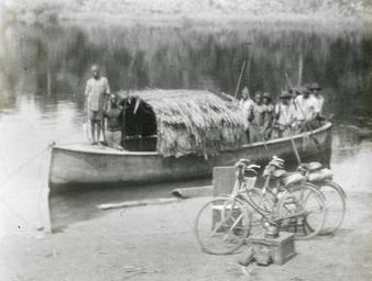 | Keywords: Iron boat, cycles etc. en route Ngombe, Congo, ca. 1900-1915 (IMP-CSCNWW33-OS12-4).jpg en Iron boat cycles etc en route Ngombe Congo ca 1900-1915 Black and white lantern slide showing an iron boat with a thatched canopy Ten Congolese men stand in the boat which is moored to the bank with wooden poles to propel the vessel Two bicycles stand on the bank along with water bottles and supplies The rowers wear shorts and shirts or are bare-chested Some wear hats that ressemble pith helmets The slide is captioned Iron boat cycles c ; En route Ngombe Ngombe-speaking peoples were feared by those of other ethnicities and missionaries alike as fierce warriors and cannibals According to an 1891 account by Harry Grattan Guinness he and Congo Balolo Mission pioneer John McKittrick had to run for their lives from a Ngombe village after it was revealed that they were to be killed This slide comes from a collection generated by missionaries working for the Congo Balolo Mission a mission begun in 1889 under the supervision of the East London Training Institute for Home and Foreign Missions that developed into the interdenominational evangelical mission Regions Beyond Missionary Union after 1900 Photographer Unknown Filename IMP-CSCNWW33-OS12-4 tif Coverage date 1900/1915 Subject unesco Inland water transport; Missionary work; Part of collection International Mission Photography Archive ca 1860-ca 1960 Part of subcollection Photographs from the Centre for the Study of World Christianity University of Edinburgh U K ca 1900-ca 1940s Subject corporate name Congo Balolo Mission Repository name Centre for the Study of World Christianity Archival file Volume2/IMP-CSCNWW33-OS12-4 tif Repository address The University of Edinburgh School of Divinity New College Mound Place Edinburgh EH1 2LX United Kingdom Geographic subject country Congo Format aacr2 lantern slides 8 2 x 8 2cm Geographic subject continent Africa Rights Contact the repository for details Part of series Regions Beyond Missionary Union Congo Transport and Tinted Slides CSCNWW33/OS12 Repository email divinity-CSWC ed ac uk Date created 1900/1915 Publisher of the digital version University of Southern California Libraries Subject aat genre exterior views Format aat lantern slides; photographs Access conditions http //www ed ac uk/schools-departments/divinity/research/centres/world-christianity/collections-resources Geographic subject rivers File CSCNWW33/OS12/4 Subject lcsh Ngombe African people 1900/1915 date created author http //digitallibrary usc edu/cdm/ref/collection/p15799coll123/id/78129 PD-old-70-1923 Bicycles 1910 Boats in the Democratic Republic of the Congo Transport in the Democratic Republic of the Congo Congo-Balolo Mission Magic lantern images Images from USC Digital Library uploaded by Fæ International Mission Photography Archive ca 1860-ca 1960 |