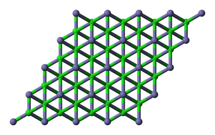 Keywords: Iron(II)-chloride-xtal-3D-balls-C.png Ball-and-stick model of part of the crystal structure of iron II chloride FeCl<sub>2</sub> X-ray crystallographic data from http //rruff geo arizona edu/AMS/download php id 10773 cif down text AMCSD originally from <small>R W G Wyckoff Crystal Structures 1 1963 Second edition Interscience Publishers New York 239-444 </small> Own 2009-03-05 Ben Mills Benjah-bmm27 Images by Ben Mills Crystal structure of iron II chloride |