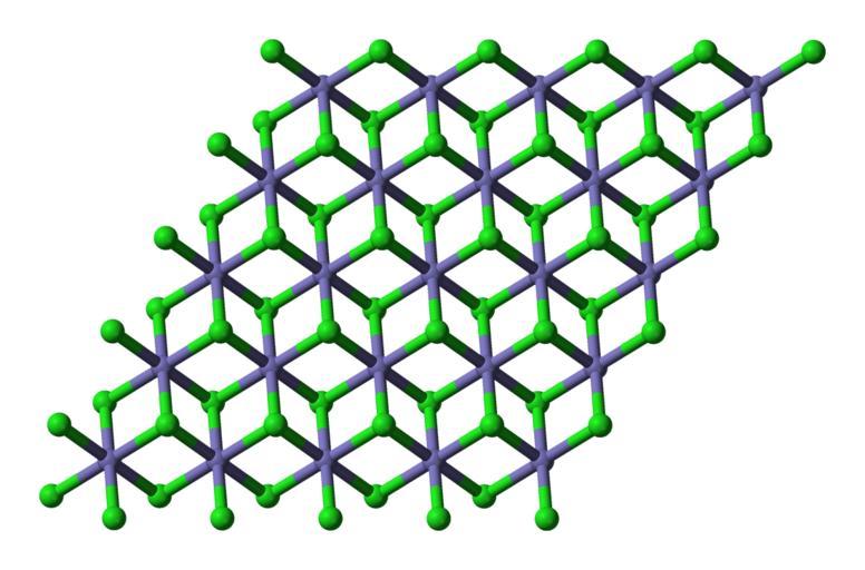 Keywords: Iron(II)-chloride-xtal-sheet-3D-balls-A.png Ball-and-stick model of part of an FeCl<sub>2</sub> <sub> ˆž</sub> sheet in the crystal structure of iron II chloride FeCl<sub>2</sub> X-ray crystallographic data from http //rruff geo arizona edu/AMS/download php id 10773 cif down text AMCSD originally from <small>R W G Wyckoff Crystal Structures 1 1963 Second edition Interscience Publishers New York 239-444 </small> Own 2009-03-05 Ben Mills Benjah-bmm27 Images by Ben Mills Crystal structure of iron II chloride |