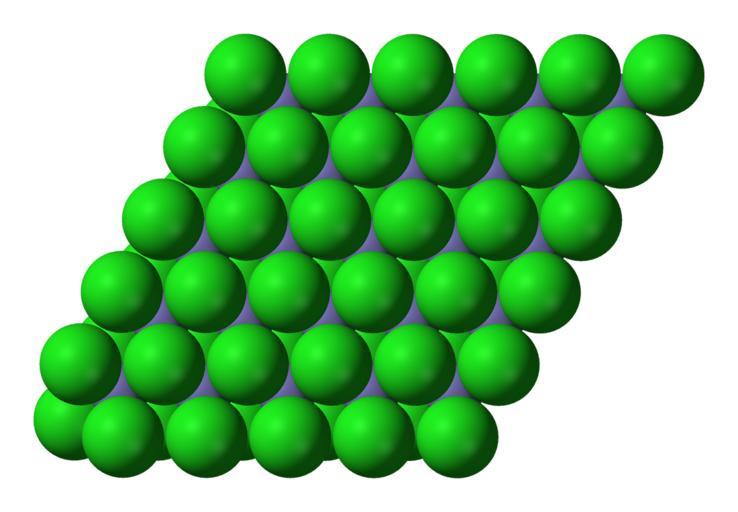Keywords: Iron(II)-chloride-xtal-sheet-3D-SF-A.png Space-filling model of part of an FeCl<sub>2</sub> <sub> ˆž</sub> sheet in the crystal structure of iron II chloride FeCl<sub>2</sub> X-ray crystallographic data from http //rruff geo arizona edu/AMS/download php id 10773 cif down text AMCSD originally from <small>R W G Wyckoff Crystal Structures 1 1963 Second edition Interscience Publishers New York 239-444 </small> Own 2009-03-05 Ben Mills Benjah-bmm27 Images by Ben Mills Crystal structure of iron II chloride |