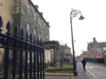 Keywords: Ironwork by Leith Hospital, Mill Lane.jpg en Lamp-post and wrought iron railings by Leith Hospital Mill Lane 2016-02-17 13 07 32 own MaryHutchison other versions cc-zero Hospitals in Edinburgh Edinburgh Leith Ironwork