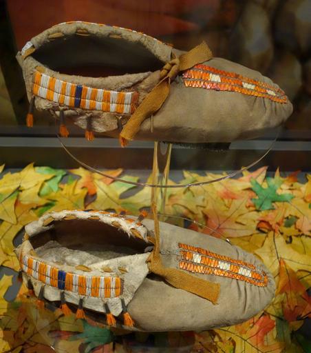 | View Original: | Iroquois (probably) moccasins with quillwork, tin cones, and hair fringe, early 1700s - Bata Shoe Museum - DSC00653.JPG (3648x4131) | |||
