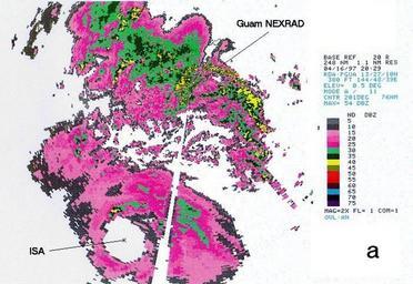 | Keywords: Isa from Guam Radar.jpg As Isa's eye moved westward away from Guam heavy showers and thunderstorms embedded in an outer rainband were directed over the island for an extended period 162029Z April NEXRAD base reflectivity https //metocph nmci navy mil/jtwc/atcr/1997atcr/ch3/02ww htm 1997-04-16 Joint Typhoon Warning Center PD-USGov-Mil-Navy Typhoon Isa Radar images of thunderstorms |