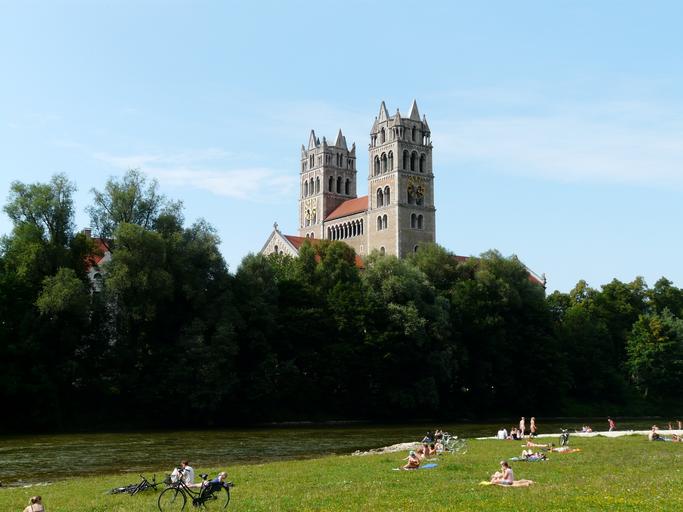 Keywords: isar river lawn bathing meadow catholic parish church church parish church st maximilian munich heinrich von schmidt neo romanesque church steeples towers
