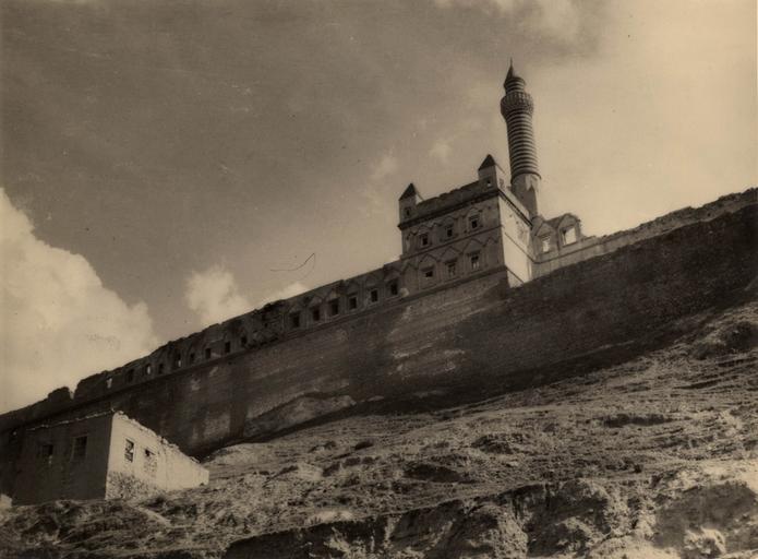 Keywords: salt araştırma saltaraştırma salt research saltresearch salt online saltonline i̇shak paşa sarayı ishakpaşasarayı i̇shak paşa ishakpaşa lale devri laledevri lale devri yapıları laledevriyapıları çolak abdi paşa çolakabdipaşa mehmet paşa mehmetpaşa i̇lk kalorifer tesisatı ilkkalorifertesisatı i̇shak paşa palace ishakpaşapalace tulip period tulipperiod tulip period buildings tulipperiodbuildings first central heating system firstcentralheatingsystem taş yapılar taşyapılar stone buildings stonebuildings stone palaces stonepalaces mimari architecture doğubeyazıt ağrı outdoor monochrome İshak Paşa Palace, located in Ağrı, Doğubeyazıt, is a border castle with 116 rooms, tombs, a mosque, walls, harem, inner and outer courtyards and a divan. The construction of the palace, known as the last monumental building of the Tulip Period, begun in 1685, on the order of Çolak Abdi Paşa, the governor of Doğubeyazıt sanjak. It was completed in 1784, under Mehmet Paşa’s governorship. The palace has a hybrid architectural style, comprising Persian, Seljuk and Ottoman characteristics. İshak Paşa Palace, also known as the first palace in the world to own a central heating system, is the second most important palace of its period, after the Topkapı Palace in Istanbul. SALT Research, Ali Saim Ülgen Archive Ağrı, Doğubeyazıt yakınlarında yer alan İshak Paşa Sarayı, 116 odası, türbesi, camisi, surları, harem daireleri, iç ve dış avluları ve divanıyla bir bey kalesidir. Lale Devri’nin son büyük anıtsal yapısı olan sarayın yapımına, Doğubeyazıt Sancak Beyi Çolak Abdi Paşa’nın emriyle 1685’te başlandı. 1784’te, Mehmet Paşa döneminde tamamlanan saray, Fars, Selçuklu ve Osmanlı üsluplarının özelliklerini taşıyan melez bir mimari karakterdedir. Dünyanın ilk kalorifer tesisatı döşenmiş sarayı olan İshak Paşa, Topkapı Sarayı’ndan sonra Osmanlı topraklarındaki en önemli saray yapısıdır. SALT Araştırma, Ali Saim Ülgen Arşivi İshak Paşa Palace, located in Ağrı, Doğubeyazıt, is a border castle with 116 rooms, tombs, a mosque, walls, harem, inner and outer courtyards and a divan. The construction of the palace, known as the last monumental building of the Tulip Period, begun in 1685, on the order of Çolak Abdi Paşa, the governor of Doğubeyazıt sanjak. It was completed in 1784, under Mehmet Paşa’s governorship. The palace has a hybrid architectural style, comprising Persian, Seljuk and Ottoman characteristics. İshak Paşa Palace, also known as the first palace in the world to own a central heating system, is the second most important palace of its period, after the Topkapı Palace in Istanbul. SALT Research, Ali Saim Ülgen Archive Ağrı, Doğubeyazıt yakınlarında yer alan İshak Paşa Sarayı, 116 odası, türbesi, camisi, surları, harem daireleri, iç ve dış avluları ve divanıyla bir bey kalesidir. Lale Devri’nin son büyük anıtsal yapısı olan sarayın yapımına, Doğubeyazıt Sancak Beyi Çolak Abdi Paşa’nın emriyle 1685’te başlandı. 1784’te, Mehmet Paşa döneminde tamamlanan saray, Fars, Selçuklu ve Osmanlı üsluplarının özelliklerini taşıyan melez bir mimari karakterdedir. Dünyanın ilk kalorifer tesisatı döşenmiş sarayı olan İshak Paşa, Topkapı Sarayı’ndan sonra Osmanlı topraklarındaki en önemli saray yapısıdır. SALT Araştırma, Ali Saim Ülgen Arşivi
