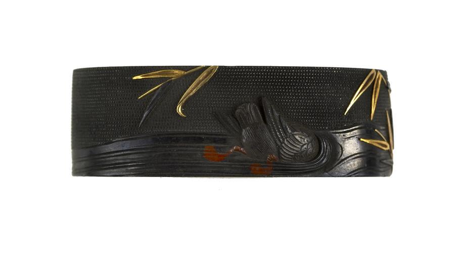 | Keywords: Ishiguro Masatsune II - Fuchi with Diving Duck - Walters 511112.jpg The lower half of a duck is shown as it dived below the surface of the water Reeds overhang the top of the composition This is part of a set with Walters 51 1113 ca 1800 1850 late Edo shakudo gold cm 3 7 l accession number 51 1112 547 William T / Henry Walters Collection Baltimore date and mode of acquisition unknown Walters Art Museum Henry Walters Acquired by William T or Henry Walters Signature Ishiguro Masamori kao place of origin Edo present-day Tokyo Japan Walters Art Museum license Fuchi in the Walters Art Museum Ishiguro Masatsune II Media contributed by the Walters Art Museum needs category review |