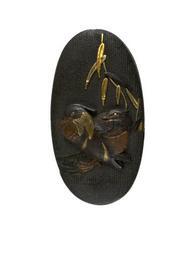 | Keywords: Ishiguro Masatsune II - Kashira with Mandarin Ducks and Reeds - Walters 511113.jpg A pair of mandarin ducks is shown standing near reeds Mandarin ducks are a symbol of marital fidelity because they mate for life This is part of a set with Walters 51 1112 ca 1800 1850 late Edo shakudo copper gold cm 3 3 l accession number 51 1113 24941 William T / Henry Walters Collection Baltimore date and mode of acquisition unknown Walters Art Museum Henry Walters Acquired by William T or Henry Walters none place of origin Edo present-day Tokyo Japan Walters Art Museum license Aix galericulata in art Reliefs of ducks Kashira in the Walters Art Museum Ishiguro Masatsune II Media contributed by the Walters Art Museum needs category review |