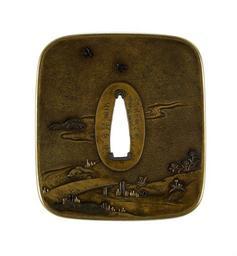 Keywords: Ishiguro Masatsune II - Tsuba with Lovers Behind Sliding Doors - Walters 51399 - Back.jpg This tsuba depicts the scene in a garden immediately outside a home At the right is a building with a veranda and rice paper doors At the left a water basin sits on a stump before a reed fence Behind the fence a cherry tree is shown in bloom In the foreground at the bottom are the rock and step leading to the house The doors are moveable When opened they reveal a scene of two lovers inside the house Along the bottom of the reverse is a stream with a bridge and birds 1830 late Edo iron sentoku gold shakudo silver copper and gold alloy cm 8 3 accession number 51 399 35493 Henry Walters Baltimore date and mode of acquisition unknown Walters Art Museum Henry Walters Acquired by Henry Walters Date Tenpô gen tsuchi-no-e tora chûshun; Translation second month in the first year of Tenpo 1830 the year of the tiger; Signature Ishiguro Masatsune place of origin Edo present-day Tokyo Japan Walters Art Museum license Tsuba in the Walters Art Museum Ishiguro Masatsune II Media contributed by the Walters Art Museum needs category review