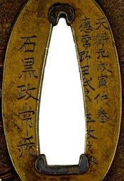 | Keywords: Ishiguro Masatsune II - Tsuba with Lovers Behind Sliding Doors - Walters 51399 - Mark A.jpg This tsuba depicts the scene in a garden immediately outside a home At the right is a building with a veranda and rice paper doors At the left a water basin sits on a stump before a reed fence Behind the fence a cherry tree is shown in bloom In the foreground at the bottom are the rock and step leading to the house The doors are moveable When opened they reveal a scene of two lovers inside the house Along the bottom of the reverse is a stream with a bridge and birds 1830 late Edo iron sentoku gold shakudo silver copper and gold alloy cm 8 3 accession number 51 399 35493 Henry Walters Baltimore date and mode of acquisition unknown Walters Art Museum Henry Walters Acquired by Henry Walters Date Tenpô gen tsuchi-no-e tora chûshun; Translation second month in the first year of Tenpo 1830 the year of the tiger; Signature Ishiguro Masatsune place of origin Edo present-day Tokyo Japan Walters Art Museum license Tsuba in the Walters Art Museum Ishiguro Masatsune II Media contributed by the Walters Art Museum needs category review |