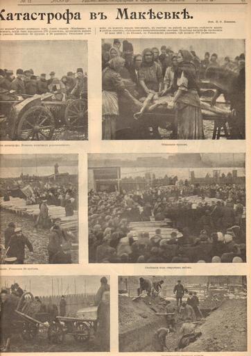 | Keywords: Iskri 12 - 5.jpg Иллюст и ованный художественно-лите ату ный и юмо истический жу нал с ка икату ами «Иск ы» 12 Воск есенье 18 ма та 1912 г Катаст офа в акеевке Фот В Ф овикова 1-го ма та в угольных копях усско-донецкого о-ва близ станции « акеевка» в шахте «Итальянка» в момент когда там находилось 170 углекопов п оизошел вз ыв газа Результаты вз ыва ужасны Извлечено 50 т упов и 30 аненых Остальные углекопы в момент вз ыва находились к счастью на аботе в д угом отделении шахты и успели спастись отделавшись незначительными ожогами Подобная катаст офа п оизошла 18 июня 1908 г в Юзовке в Рыковском уднике где погибло 270 углекопов Обмывание т упов Отпевание под отк ытым небом П иготовление б атской могилы http //www odin-fakt ru/iskry/_12_jurnala_iskry_god1912/ 18 ма та 1912 г Издатель Т-во И Д Сытина Редакто Ф И Благов Фот В Ф овикова PD-RusEmpire Iskri 1912 12 Italianka coal mine 1912 in Makeevka Files uploaded by Andrew Butko from various sources |
