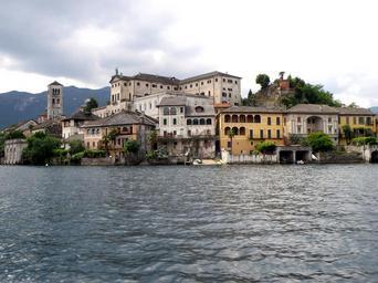 Keywords: isola san giulio italy sea ocean water sky clouds buildings shoreline nature outside architecture destinations trees mountains