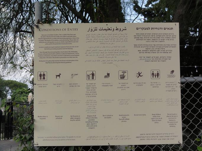| Keywords: Israel Batch 3 (130).JPG Entrance sign at Bahá'í World Centre Haifa Israel Conditions of Entry own 2011-08-05 18 55 24 User Mattes 32 8117947222 34 9840433333 GPS data may be inaccurate EXIF data regarding date and time may be inaccurate Commonist FoP-Israel Trilingual signs in Israel 2011 in Israel Signboards at the Bahá'í Terraces Rectangular signs Taken with Sony DSC-HX5VN Work by Mattes 2011 User Mattes/Contributions/Topics/Israel User Mattes/Contributions/Topics/banners coat of arms flags logos seals and signs |