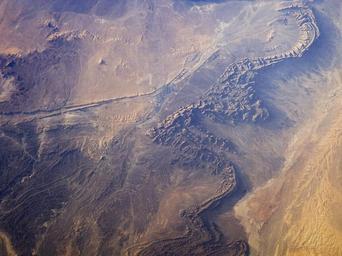 | Keywords: ISS015-E-15323 lrg.jpg en The Bechar Basin of northwest Algeria formed as layers of sedimentary rocks from the Paleozoic Era 250-540 million years ago folded and cracked during collisions of Africa and Europe during the Tertiary Period 2-65 million years ago Hydrocarbon coal oil reservoirs are tucked among the fragments of sedimentary rocks and fossilized coral reefs that make up the basin's rock layers which are up to 8 000 meters thick In this photograph of part of the basin captured by astronauts on the International Space Station on June 27 2007 dark brown to tan folded ridges of these Paleozoic sedimentary layers extend across the image from top to bottom Sand dunes are visible to the north south and west of the city of Bechar gray-blue region to the left of the ridges at image center river channels are dry most of the year in the arid climate of the region Unconsolidated loose sands left in the channels by intermittent streams are transported by surface winds after the water is gone This leads to the formation of individual dunes and larger dune fields both bright tan in color along the wadi courses which also concentrate sands from other sources; dune fields are visible to the south of Bechar and at image lower right The oblique view looking at an angle not straight down from the International Space Station of this astronaut photograph accentuates cliff and dune shadows providing a sense of the topography of the region 2012-01-28 http //earthobservatory nasa gov/IOTD/view php id 7934 NASA -- Featured astronaut photograph eol jsc nasa gov/scripts/sseop/photo pl mission ISS015 roll E frame 15323 ISS015-E-15323 was acquired June 27 2007 by the www nasa gov/mission_pages/station/expeditions/expedition15/index html Expedition 15 crew with a Kodak 760C digital camera using a 70 mm lens The image is provided by the ISS Crew Earth Observations experiment and the Image Science Analysis Laboratory Johnson Space Center The image in this article has been cropped and enhanced to improve contrast The spaceflight nasa gov/home/index html International Space Station Program supports the laboratory to help astronauts take pictures of Earth that will be of the greatest value to scientists and the public and to make those images freely available on the Internet Additional images taken by astronauts and cosmonauts can be viewed at the NASA/JSC eol jsc nasa gov/ Gateway to Astronaut Photography of Earth centre of image Custom license marker 2012 01 28 Uploaded with UploadWizard Satellite pictures of Béchar Province Paleozoic geology Béchar Rivers of Béchar Province |