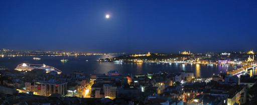 Keywords: Istanblue.jpg en View of the Golden Horn and Bosphorus background from Galata Tower with full moon The Hagia Sophia right is illuminated Istanbul Turkey Own Jorge1767 2008 41 1 13 N 28 58 52 6 E Bosphorus at night Golden Horn