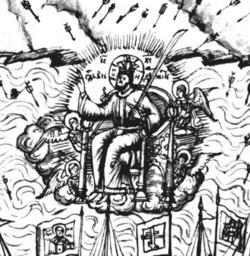 | Keywords: IstSib042 1.jpg  Явление и заступничество Вседе жателя п и нападении тата на казачьи ст уги Исто ия Сиби ская  ультимедиа Цент  ГУ http //www mmedia nsu ru/vbook/vbook/obj8/MINIATURES htm 1697 - 1703 С У Ремезов Author died more than 70 years ago - public domain PD-old Remezov Chronicle |