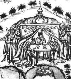 | Keywords: IstSib047 1.jpg Кучум обсуждает с му зами чудесное видение Исто ия Сиби ская ультимедиа Цент ГУ http //www mmedia nsu ru/vbook/vbook/obj8/MINIATURES htm 1697 - 1703 С У Ремезов Author died more than 70 years ago - public domain PD-old Remezov Chronicle |