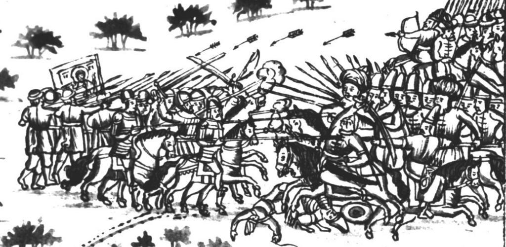 | Keywords: IstSib065 1.jpg  Битва казаков с от ядом  аметкула в у очище Шаншинском Исто ия Сиби ская  ультимедиа Цент  ГУ http //www mmedia nsu ru/vbook/vbook/obj8/MINIATURES htm 1697 - 1703 С У Ремезов Author died more than 70 years ago - public domain PD-old Remezov Chronicle |