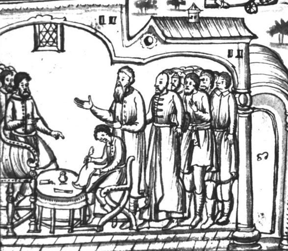 | Keywords: IstSib067 1.jpg  Е мак диктует послание о победе над Кучумом ца ю Ивану Васильевичу Исто ия Сиби ская  ультимедиа Цент  ГУ http //www mmedia nsu ru/vbook/vbook/obj8/MINIATURES htm 1697 - 1703 С У Ремезов Author died more than 70 years ago - public domain PD-old Remezov Chronicle |